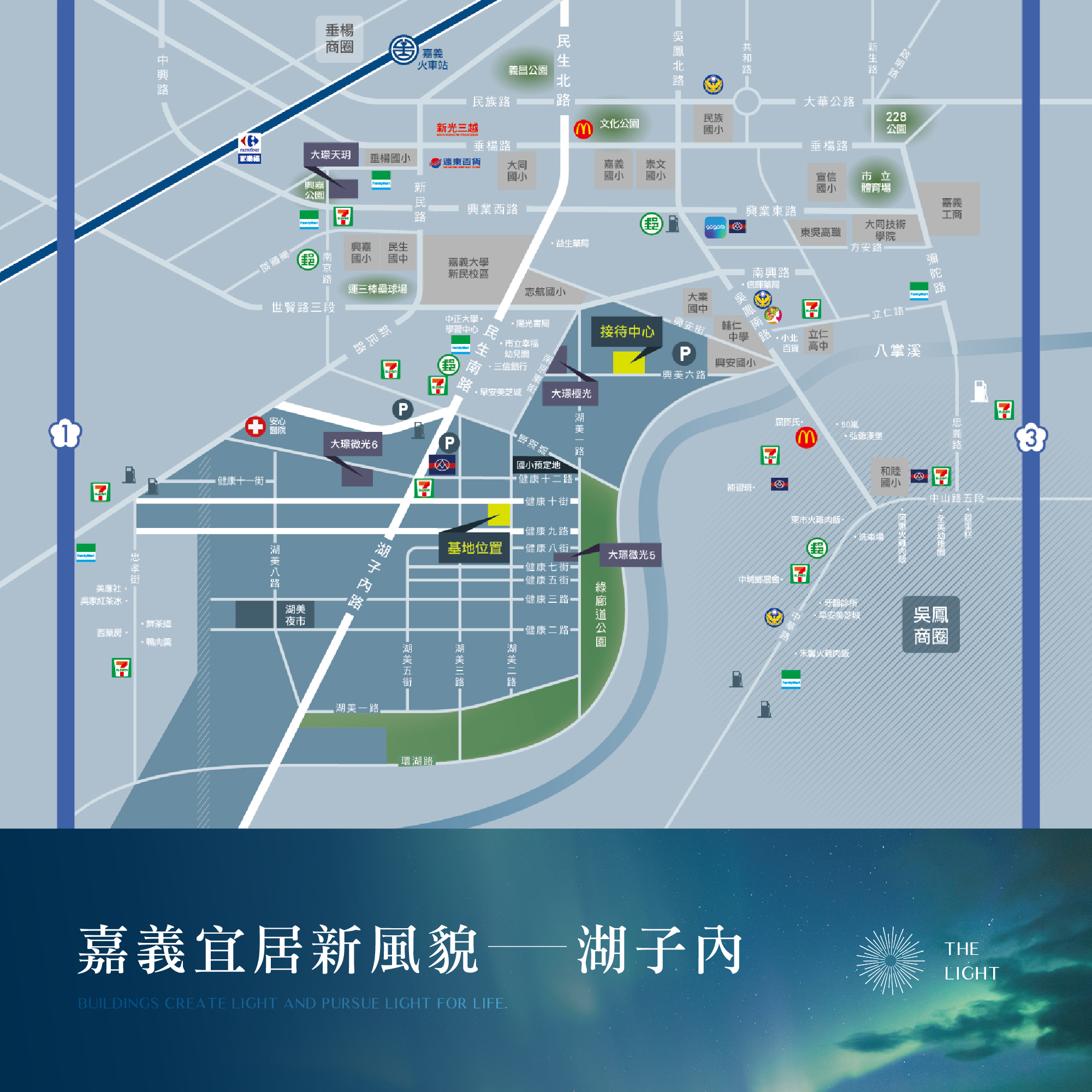 嘉義宜居新風貌——湖子內。200公尺散步公園廊道,800公尺連結民生南路商圈,7-ELEVEN、全聯滿足採買機能。近82快速道路,串聯國3、國1。